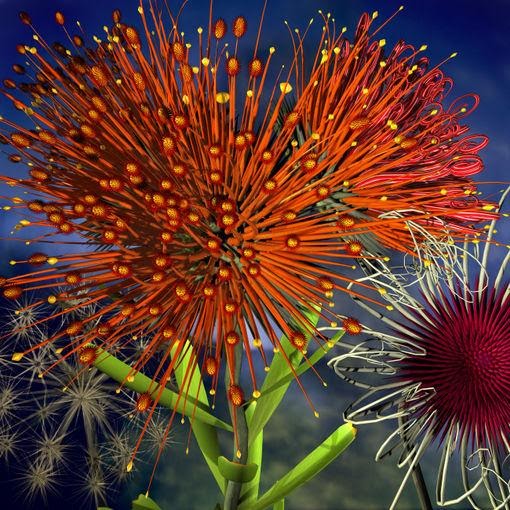 Morphogenesis series is his attempt to create computer models of native Australian flora. The digital design has been mutated and crossbred to give way to a new species of flora.